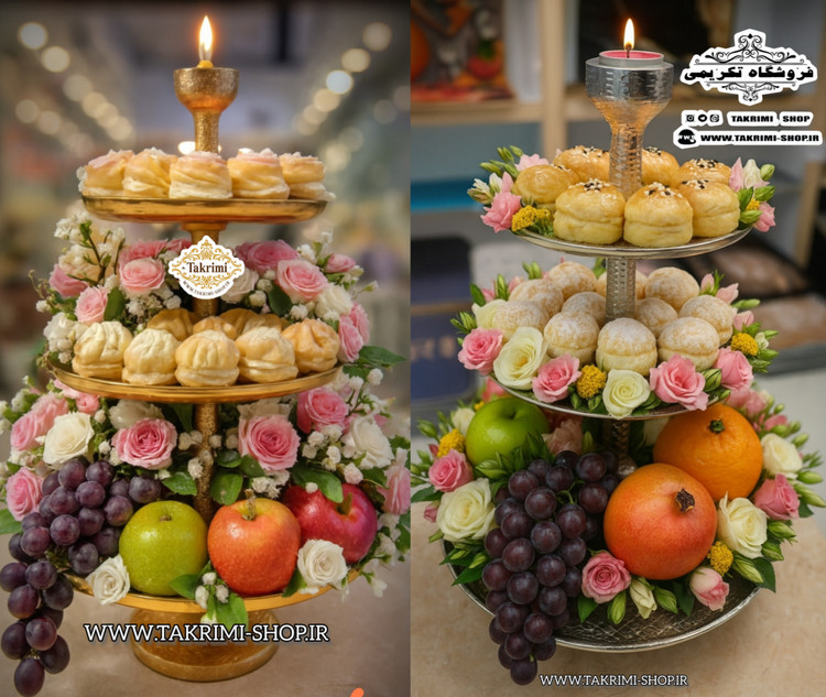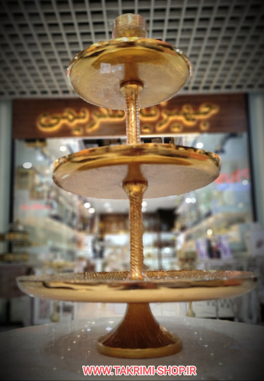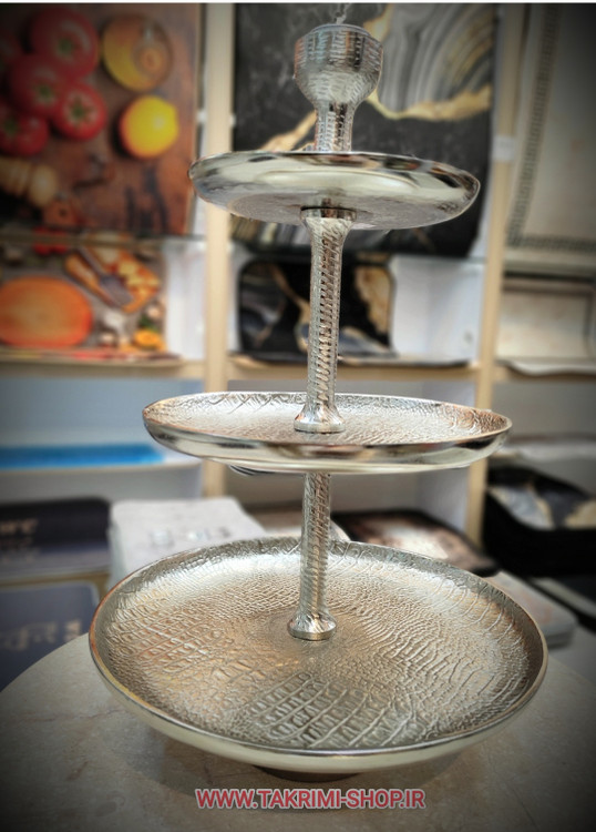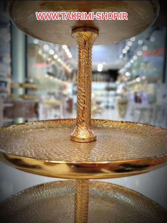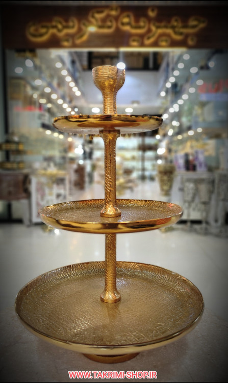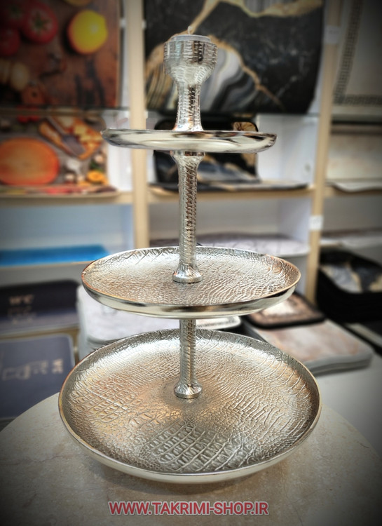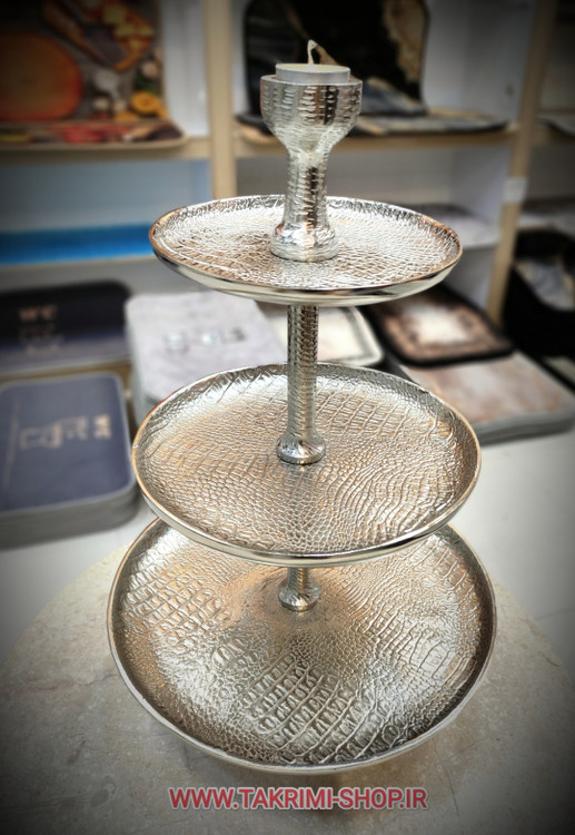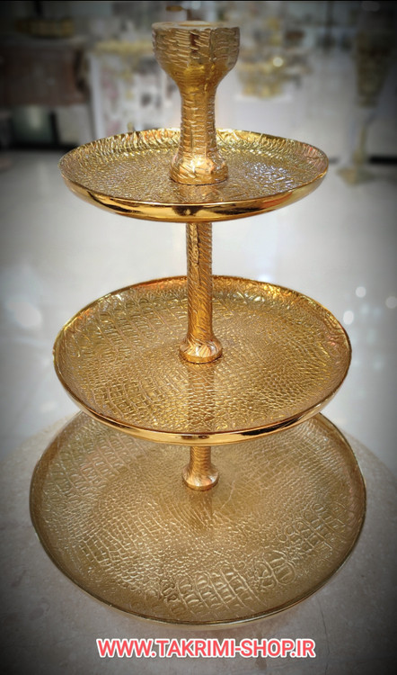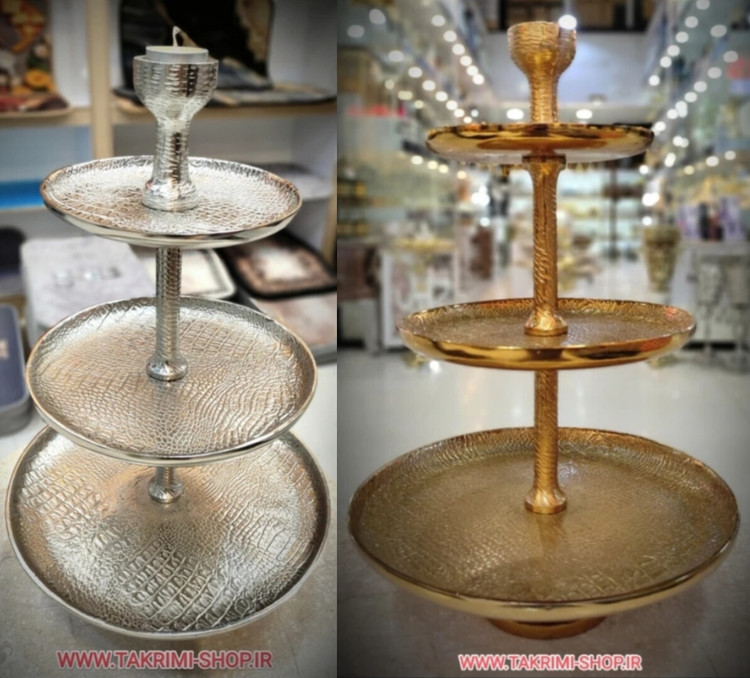 شیرینی خوری میوه خوری 3 سه طبقه سایز خیلی بزرگ وارمر دار چرمی پوست ماری مناسب برای تالارها ( طلایی و نقره ای )( تولیدی تکریمی شاپ )