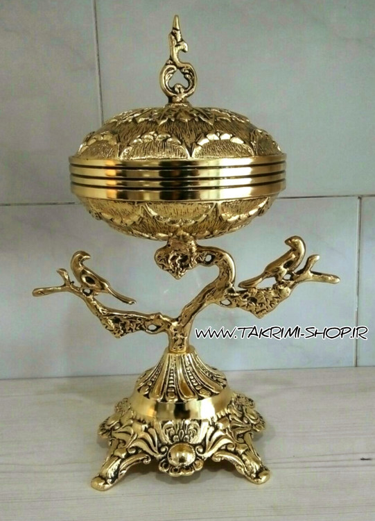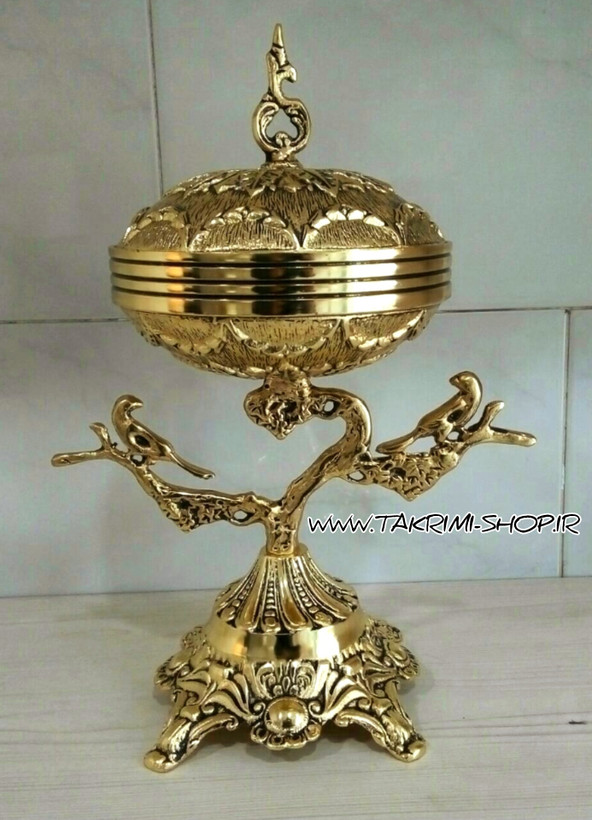 ظرف کاسه آجیل خوری یا شکلات خوری طرح گلبرگ سلطنتی با دسته گنجشک طرح برنجی