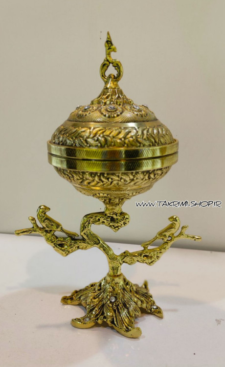 ظرف کاسه آجیل خوری سلطنتی جوجه گنجشک پرنده با پایه ریشه درخت طرح برنجی