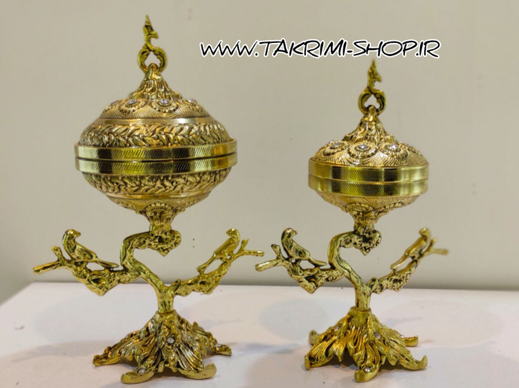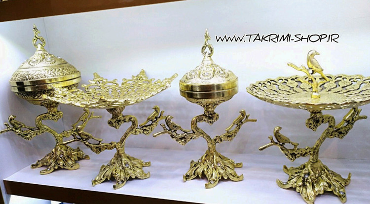 ظروف ست سرویس پذیرایی چهار 4 تکه پارچه سلطنتی جوجه گنجشک پرنده با پایه ریشه درخت طرح برنجی