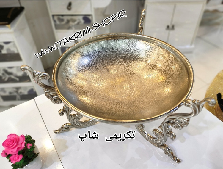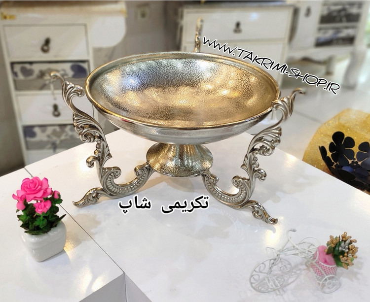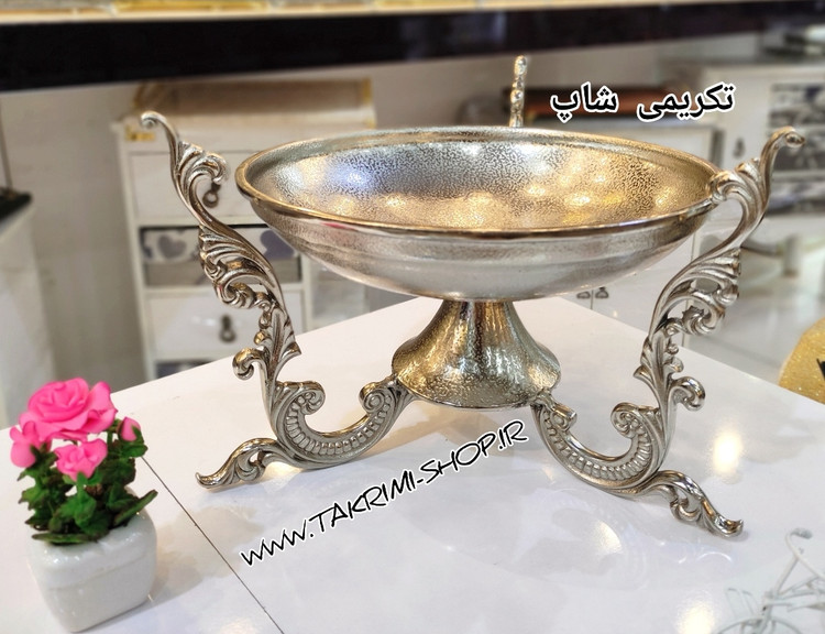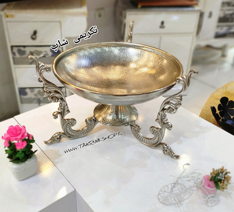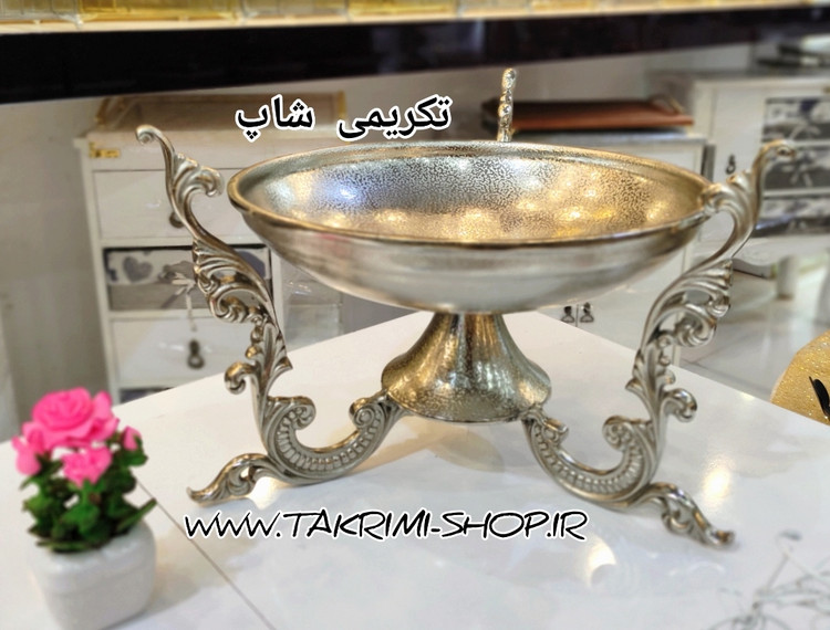 ظرف کاسه میوه خوری دسته دار سلطنتی کلاسیک یاس نقره ای آلومینیومی ( تکریمی شاپ )