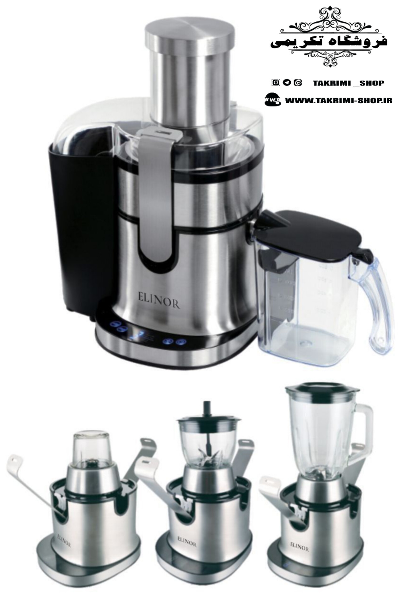 آبمیوه گیری چهار ۴ کاره منظوره لمسی الینور مدل 4600 قدرت ۱۰۰۰ وات ، ۵ سرعته ( شامل : آبمیوه گیر ، مخلوط کن ، آسیاب ، خردکن )