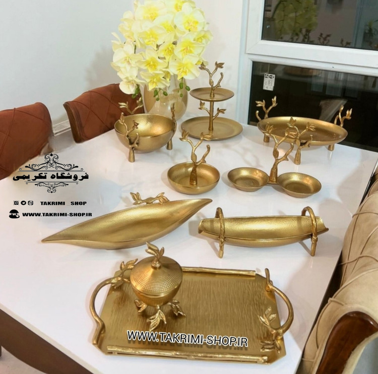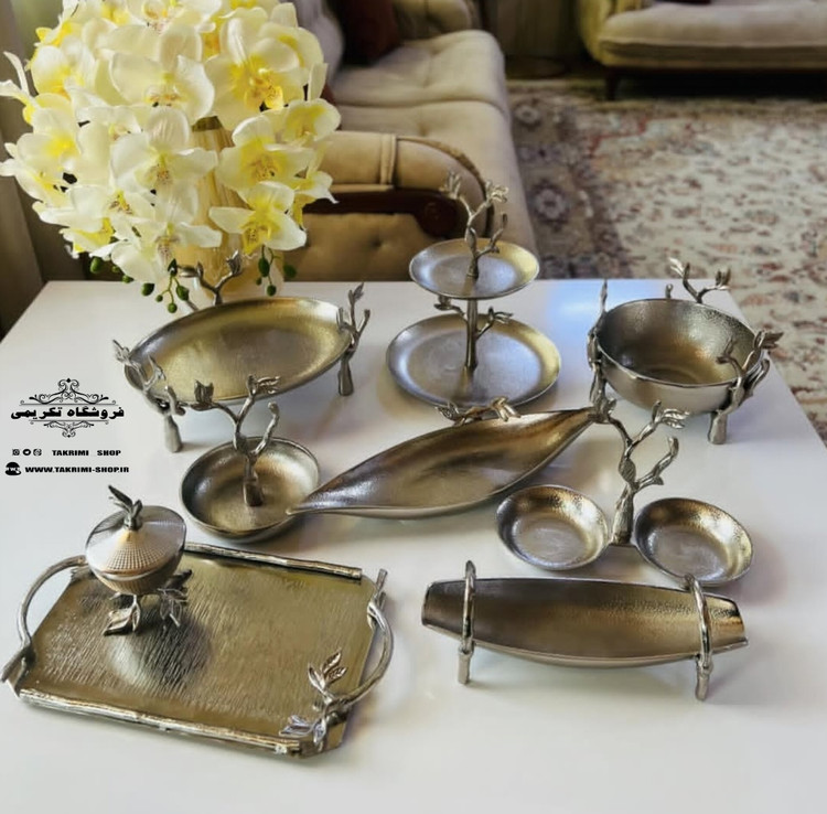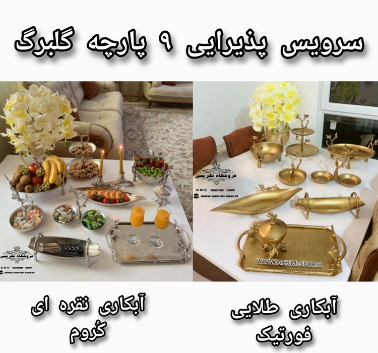 9 تکه 🟰 ▫️میوه خوری ▫️شیرینی خوری 2 طبقه ▫️آجیل خوری ▫️شکلات خوری ▫️اردو خوری ▫️جا کاردی ▫️رولت خوری ▫️سینی ▫️قندان