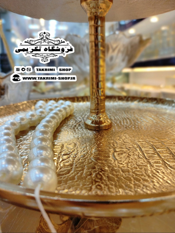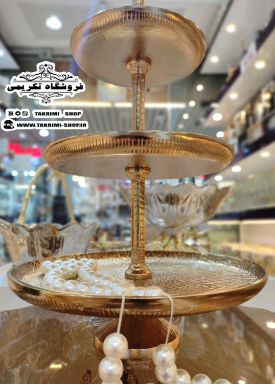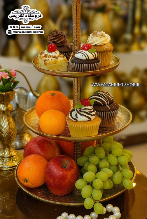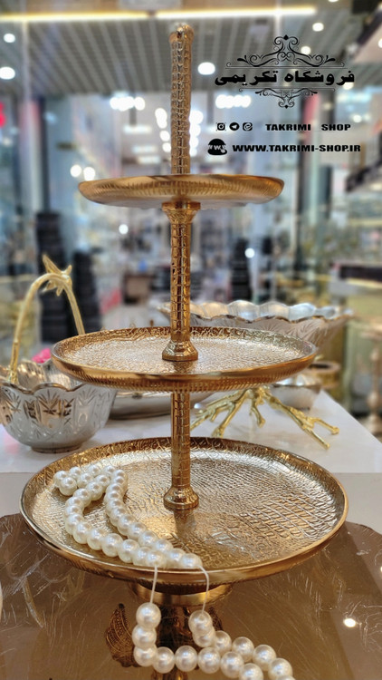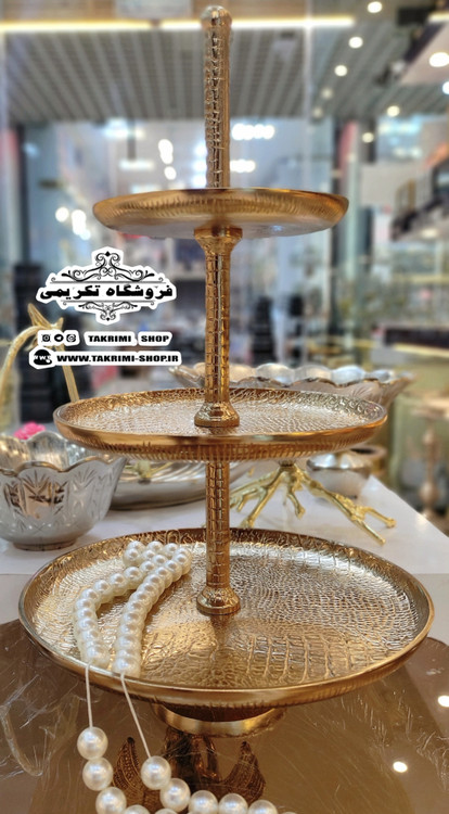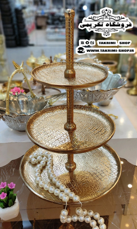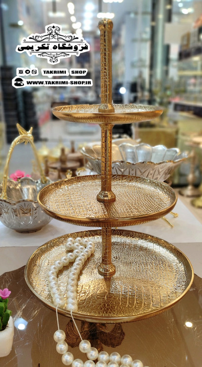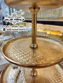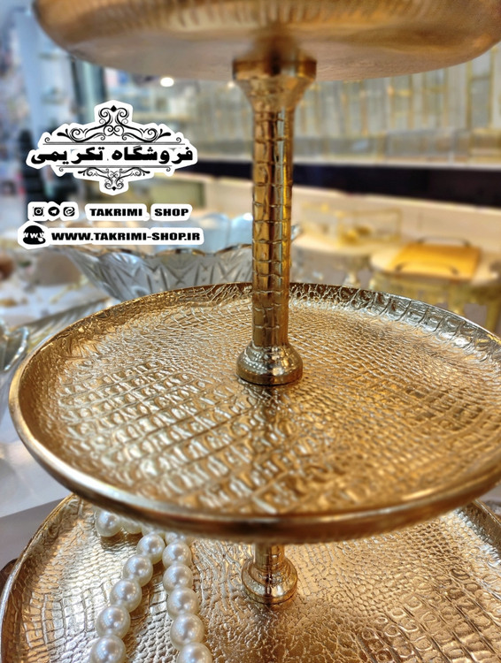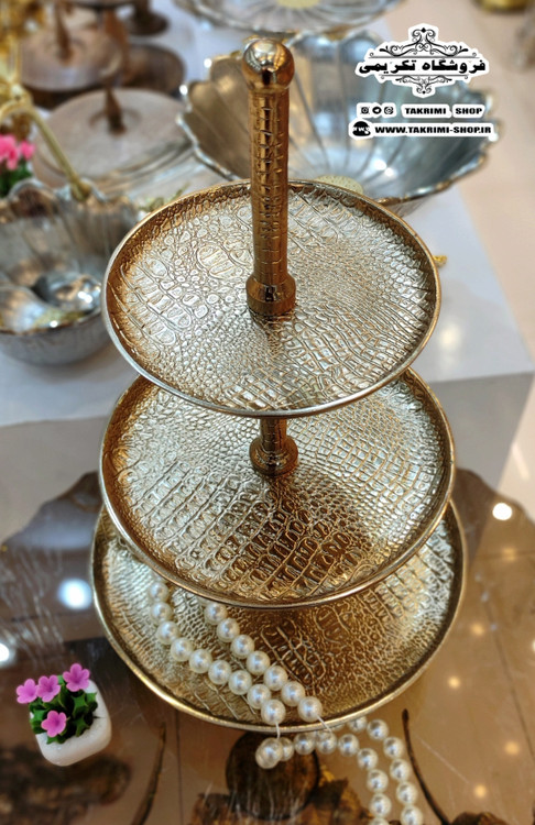 استند ظرف شیرینی خوری 3 سه طبقه سایز بزرگ مناسب هتلی تالاری چرمی طلایی فورتیک ( تولیدی تکریمی شاپ )
