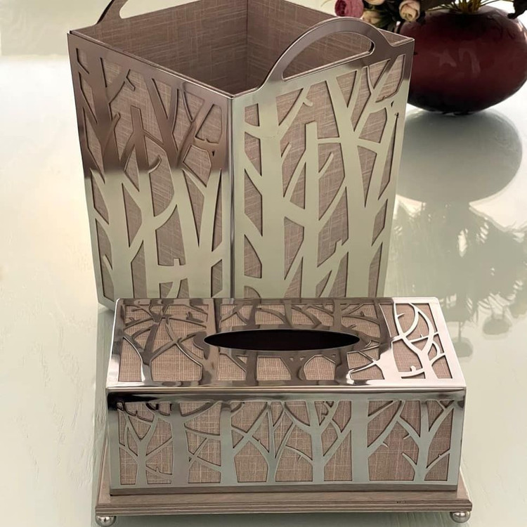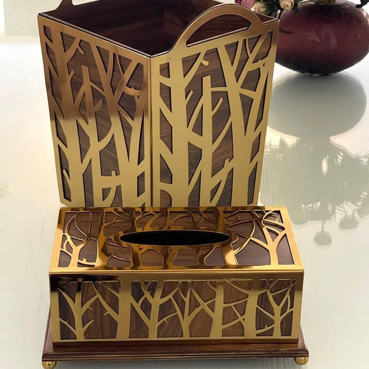 سطل و جا دستمالی فلزی آبکاری فورتیک طرح درخت ( 2 رنگ طلایی و نقره ای )
