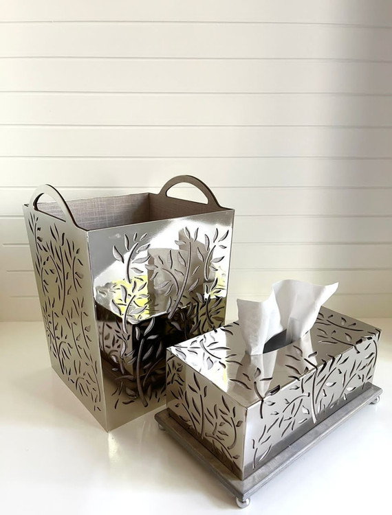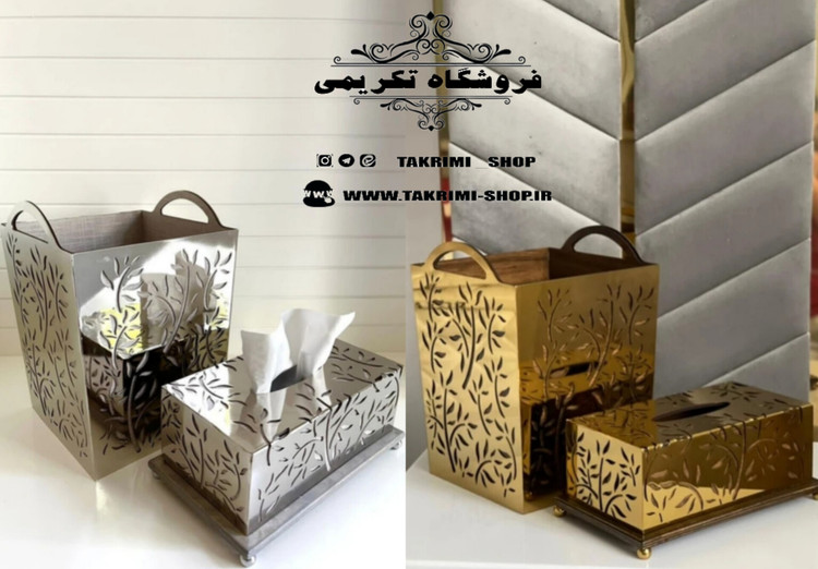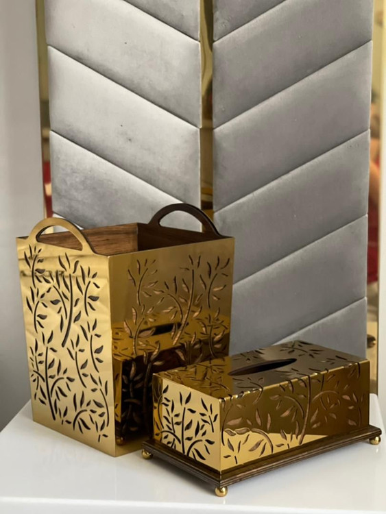 سطل و جا دستمالی فلزی آبکاری فورتیک طرح برگ ( 2 رنگ طلایی و نقره ای )