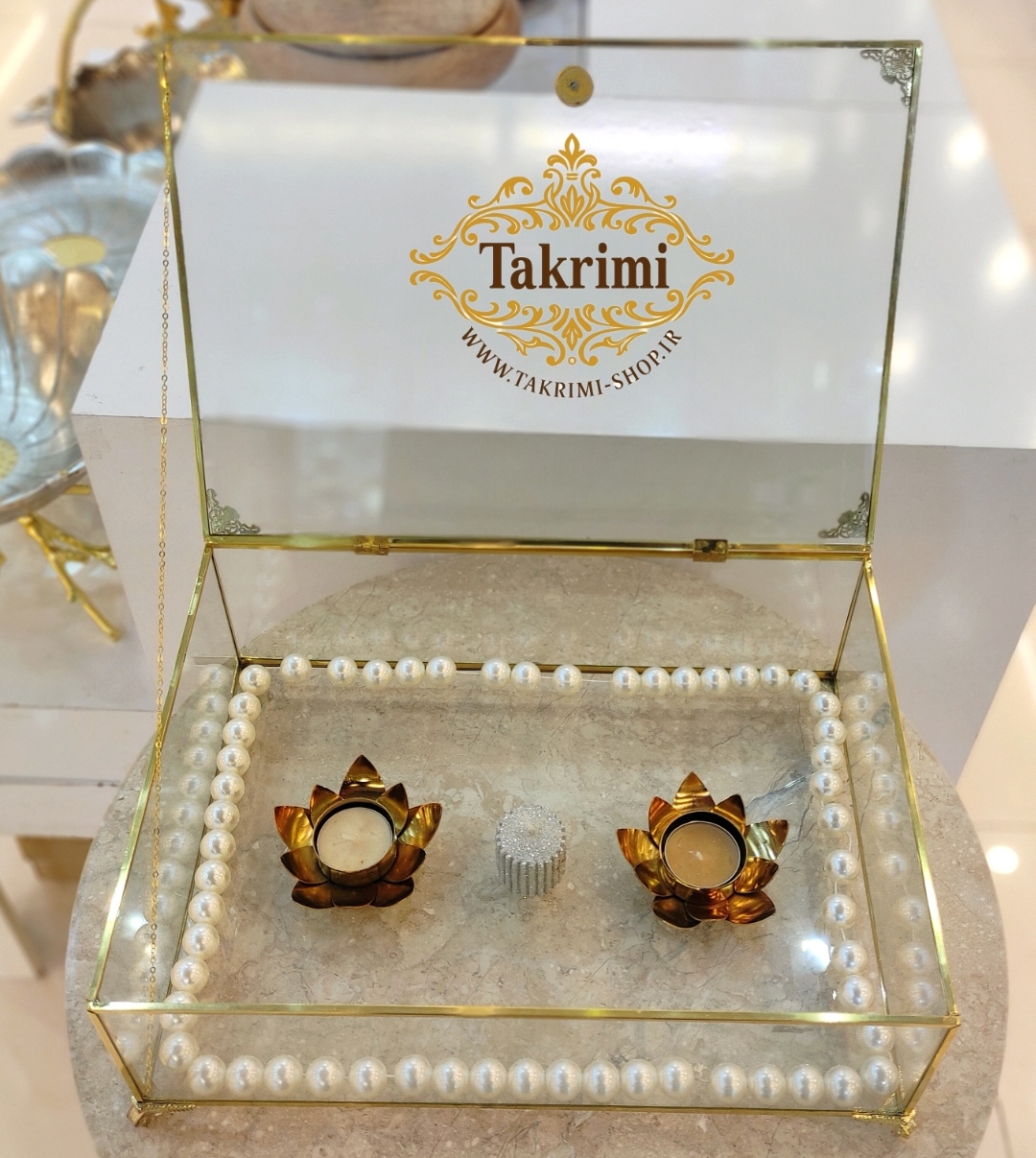 باکس شیشه ای خواستگاری خاستگاری شب یلدایی شب چلگی چله ای شیرینی مینی کاپ کیک باقلوا درب دار مستطیل ( خیلی بزرگ ) طلایی جنس شیشه ای و برنج خالص